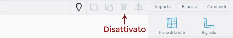 in inglese) di allineare due o più solidi posti sul piano di lavoro. Il pulsante Allinea è posto nel Menù principale, sul lato destro, e normalmente il pulsante è disattivato (cioè è in grigio chiaro e non cliccabile). Questo perché, per essere attivo, è necessario selezionare almeno 2 oggetti.